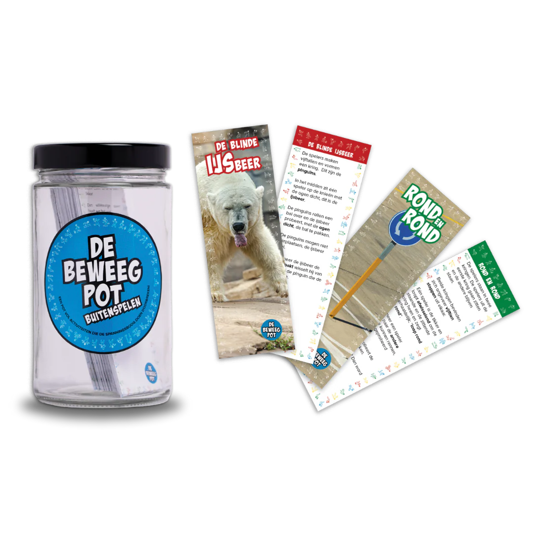 De Beweegpot Buitenspelen is een pot vol spelletjes en leerzame activiteiten voor buiten. De pot bevat tientallen verschillende kaarten met activiteiten die speciaal ontwikkeld zijn voor op het schoolplein, in de speeltuin, op de naschoolse opvang, in de wijk of in de tuin. De Beweegpot Buitenspelen biedt urenlang plezier en uitdagingen voor kinderen van alle leeftijden.